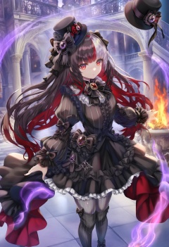 masterpiece, best quality,1girl, simple background, solo, dress, long hair, pantyhose, red eyes, multicolored hair, white background, black dress, animal ears, full body, black footwear, hat, black hair, long sleeves, frills, two-tone hair, standing, frilled dress, vertical-striped pantyhose, black bow, white hair, jewelry, striped clothes, vertical-striped clothes, puffy sleeves, striped pantyhose, black hat, goth fashion, bow, brooch, hair bow, puffy long sleeves, colored inner hair, top hat, purple fire, boots, grey pantyhose, thigh boots, fire, red hair <lora:torinoXLlokr8f-000182:0.95>