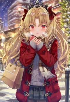 masterpiece, best quality,1girl, ereshkigal \(fate\),  solo, long hair, looking at viewer, blush, skirt, red eyes, plaid, pantyhose, phone, outdoors, long sleeves, red coat, bag, scarf, blonde hair, sweater, cellphone, open clothes, closed mouth, coat, holding, holding phone, black pantyhose, duffel coat, parted bangs, red bow, pleated skirt, bow, fringe trim, hair bow, shoulder bag, sleeves past wrists, lamppost, plaid skirt, pout, very long hair, black skirt, two side up, brown scarf, open coat, hands up, plaid scarf, cowboy shot, aran sweater, cable knit, standing, night, miniskirt, smartphone, red jacket, tree, breath, chain, tiara, winter, night sky, jacket, twitter username, hair between eyes, winter clothes, sky, casual, paper bag, gold chain, plaid headwear, white sweater, snowing, adapted costume <lora:torinoXLlokr8f-000182:0.95>