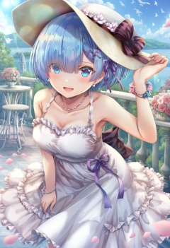 masterpiece, best quality,1girl, rem \(re:zero\),  solo, white dress, dress, blue eyes, short hair, blue hair, wrist scrunchie, looking at viewer, smile, hair ornament, outdoors, breasts, x hair ornament, open mouth, jewelry, necklace, hat, bare shoulders, sleeveless, day, scrunchie, collarbone, sleeveless dress, frilled dress, petals, bird, hair over one eye, medium breasts, :d, sky, blush, cleavage, blue sky, ribbon, earrings, bracelet, frills, flower, arm up, hand on headwear, alternate costume, cloud, railing, hair ribbon, sun hat, white hat, tree, purple ribbon, casual, hat flower, strap gap, bare arms, cowboy shot, spring \(season\), dove, blunt bangs, hairclip, sundress, from above, looking up, pearl necklace <lora:torinoXLlokr8f-000182:0.95>