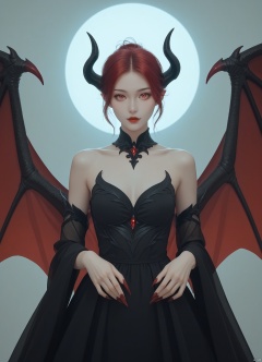 (score_9,score_8_up,score_7_up),1girl, girl demon, red hair, red eyes, wings, claws, black dress, beautiful_face