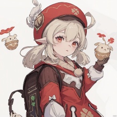 1girl, solo, long hair, looking at viewer, bangs, blonde hair, red eyes, gloves, long sleeves, hat, white background, dress, hair between eyes, twintails, ahoge, pointy ears,bag, low twintails, red dress, backpack, feathers, red headwear, brown gloves, cabbie hat, hat feather, clover, four-leaf clover, white feathers, klee \(genshin impact\), klee (genshin impact)