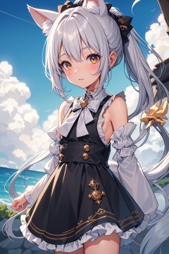 Best quality, perfect lighting, Blue sky white clouds,Outdoor, Blush,double ponytail, extra ears, cat ears , bare shoulders,In a maid costume, Gradual pupil appears intense,A small tuft of gray white hair on the head,a yellow bow tied to the chest, and a brooch symbolizing a witch.(loli:1.7), <lora:YG萌萌哒兽耳娘:0.75>,