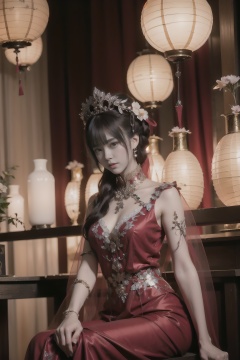 a woman sitting in a chair with a lot of lights behind her and a lot of lanterns behind her,Chen Chun,classical painting,a painting,fantasy artbest quality,masterpiece,realistic,masterpiece,Highly detailed,extreme detail description, <lora:中式花嫁v1:0.8>,Red wedding dress,
