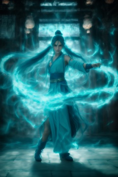 fighting stance,dancing,ancient-costume,cyan-aura,using cyan-magic,cyan-magic,1girl,solo,long hair,blue eyes,<lora:magic_fighting_cyan_512_15:0.8>,