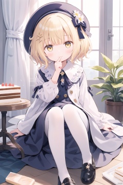 (masterpiece), (best quality), illustration, ultra detailed, hdr, Depth of field, (colorful), petite,loli,1girl, solo, dress, hat, yellow eyes, short hair, food, blonde hair, finger to mouth, flower, looking at viewer, ribbon, cake, shoes, sitting, white pantyhose