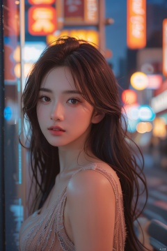 1girl, solo, long hair, looking at viewer, lips, brown eyes, black hair, blurry, upper body, realistic, night, neon lights, blurry background, city, city lights, brown hair, depth of field