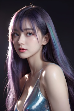 1girl, solo, blue eyes, hair over one eye, smile, looking at viewer, upper body,(holo hair), (close eyes),(purple|blue hair),breasts, lips, bangs, nose, closed mouth, medium breasts, realistic, simple background,(realistic:1.5),masterpiece, Extremely detailed CG unity 8k wallpaper, best quality, highres:1.2),(ultra_detailed, UHD:1.2),(pixiv:1.3),perfect illumination,distinct,unreal engine,sidelighting,perfect face,detailed face,beautiful eyes,pretty face,(bright skin:1.3),idol,ulzzang-6500-v1.1,soft smile,(simple background),(depth of field),(ringed eyes:1.4), (holo,holographic hair,holographic body),water, holo water,  <lora:YG极致写实极品美女:0.75>,