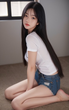 1girl,solo,sitting,long hair,realistic,looking at viewer,black hair,best quality,(high quality:0.9),4k,8k,(masterpiece:1,2),highres,high resolution,8k,RAW photo 8k,ultra high res,upon_body,photorealistic,dslr,8k uhd,Photograph,full body,beautiful fingers,Bare leg,Beautiful face,fair_skin,white sox,t-shirt,cutoffs,<lora:Student boon boon01-2:0.8>,