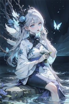(masterpiece), (best quality), illustration, ultra detailed, hdr, Depth of field, (colorful),This is a masterpiece that exudes exceptional quality. The illustration is ultra-detailed, utilizing HDR technology to create a sense of depth. The subject matter is an original, delicate, and beautiful artwork, vibrant with color and filled with fantastical elements. The girl is sitting by a deep sea, surrounded by flowing water, with a dull blue World Tree in the background, situated in a cemetery. The serene and dreamy atmosphere gives the entire scene a soulful and enchanting quality. Her pale complexion, azure blue eyes that glow, and silver hair adorned with flowers create a captivating portrait. She wears a Lolita-inspired fashion, expressionless with her mouth closed. The backgrounds range from white, transparent, circular options, and there are also flying translucent blue butterflies that add a sense of liveliness to the piece..,1girl
