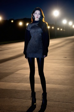 (best quality:1.1),ultra-detailed,absurdres,1girl , edge light,******* photo,Flash Photography,Split Lighting,front lights,font bright light,Night photography,volumetric lighting,atmospheric lighting,dramatic contrast,Shadow effect,, 1girl, solo,(masterpiece, best quality,hires,Perfect features:1.2),finely detailed eyes and face,(pale skin:1.3),cowboy shot,Wellington,, Grey_knit_sweater_dress, black_leggings, black_ankle_boots, black_leather_tote_bag, silver_hoop_earrings,GX girl
