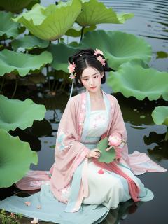 As the sun sets,ripples form on the surface of the lotus pond. The Hanfu maiden sits on a lily pad,her sleeves adorned with delicate pink lotus blossoms. The flowers bloom,their petals unfolding like rosy blush. She gazes quietly at her reflection in the water,a sense of tranquility filling her heart.,