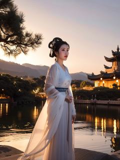 The ancient city in the river twinkling lights,lights reflected on the river,like a bright Milky Way,a pure white Hanfu girl standing alone on the boat,