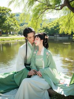 Willow trees lean over the stream,their branches swaying gently. The Hanfu maiden sits in the shade of the willows,her sleeves adorned with embroidered green willow leaves. A soft breeze rustles the branches,as if they whisper secrets. She closes her eyes,listening intently,her heart filled with tranquility.,