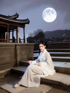 Moonlit Temple: Moonlight spills over an ancient temple. The Hanfu maiden sits on the stone steps,her face bathed in the ethereal glow of the moon.,