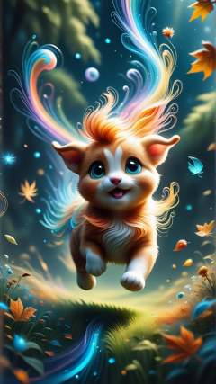 <lora:ElementWindPDXL:0.5>score_9, score_8_up, score_7_up, ElementWind Playful corgi, Full body, Bright eyes, Floppy ears, Wagging tail, Grass field, Blue sky, Golden hour, Soft light, Vibrant colors, High contrast, Smooth texture, Painterly brushstrokes, Illustration, Detailed, Cute, Whimsical, Joyful, Dynamic pose, Running, Chasing, Leaves, Autumn, Forest, Midground, Dreamy atmosphere, Calm mood, wind, blowing ethereal streaks, gusts