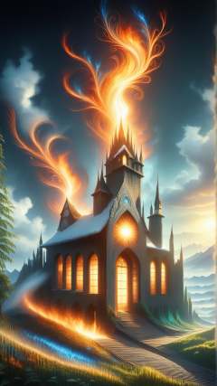 <lora:ElementFirePDXL:0.8>score_9, score_8_up, score_7_up, ElementFire Orange Realistic oil painting of a snowy mountain village with an overgrown library consumed by nature, Old wooden buildings, Stone pathways, Snow-covered trees, Blue skies, Sunlight shining through the clouds, Green, lush vines and moss covering the library, Foliage and greenery growing from the library's windows and doors, Intricate architectural details, Dimly lit, Mysterious, Peaceful, Idyllic, Awe-inspiring, Majestic, Serene, Warm, Inviting, Cozy, Vibrant, Breathtaking, Panoramic, Breathtaking, Dramatic, Epic, Picturesque, Grandiose, Masterpiece, Timeless, Vintage, Rich colors, Crisp details, High contrast, Textured, fire, flames, blazing, (Masterpiece:1.3) (best quality:1.2) (high quality:1.1)