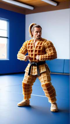 <lora:WaffleStyleXL:1>WaffleStyle  a 33 y.o. man with a ponytail practicing martial arts in a gym, made out of waffles, (Masterpiece:1.3) (best quality:1.2) (high quality:1.1)