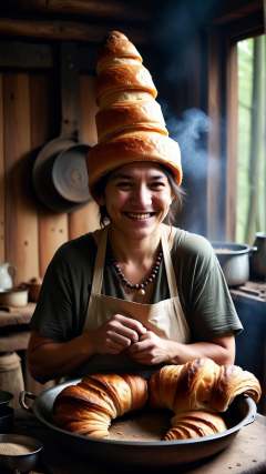 Cinematic photo of <lora:CroissantStyleXL:1> CroissantStyle portrait, looking at viewer, solo, half shot, detailed background, detailed face, (<lora:AbsinthePunkAI:0.5>, AbsinthePunkAI theme:1.1), warm smile, shaman, wearing (Brown:0.7) witch hat, beaded necklace, rustic hut in the forest, indoors, cluttered dirty kitchen, parchment, kitchen mortar, steaming iron cauldron, decoction, small boxes on shelves, herbs, mushrooms, beads, dark sinister atmosphere, dim lighting, in location: enchanted forest clearing, detailed background, dynamic angle, atmospheric