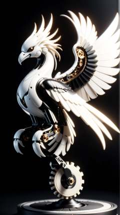 <lora:P14n03l3g4nt3b0n3XL:1>P14n03l3g4nt3b0n3 a mechanical phoenix mid-flight, intricate gear-work visible, black, white, ebony, ivory, luxury, 24mm, (analog, cinematic, film grain:1.3), Bokeh DOF, (Masterpiece:1.3) (best quality:1.2) (high quality:1.1)