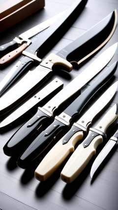 <lora:P14n03l3g4nt3b0n3XL:1>P14n03l3g4nt3b0n3 Knives, black, white, ebony, ivory, luxury, 24mm, (analog, cinematic, film grain:1.3), Bokeh DOF, (Masterpiece:1.3) (best quality:1.2) (high quality:1.1)