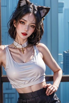 black hair,animal ears,long hair,hand on hip,underwear,panties,sleeveless,skirt,looking at viewer,parted lips,white panties,necktie,pencil skirt,sleeveless shirt,smile