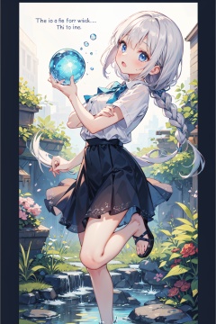 absurdres,absolutely resolution,incredibly absurdres,highres,ultra detailed,official art,unity 8k wallpaper,Kinetic Typography,BREAK(1girl, solo:1.4),beautiful and shiny skin,coquettish skin,jumping,from_sidepanorama,crossed arms,;d,BREAKfrench fishtail braid,ghostwhite hair,Sheer frilled blouse worn over a slip dress long skirt with heeled mules,BREAKMoss-covered stones, Stone lanterns, Moss gardens, Zen serenity, Rainy day, Meditation,Rhododendrons,BREAK(azure , english text, border:1.6),BREAKnice hands,perfect hands,<lora:增强减少细节add_detail:0.3>,