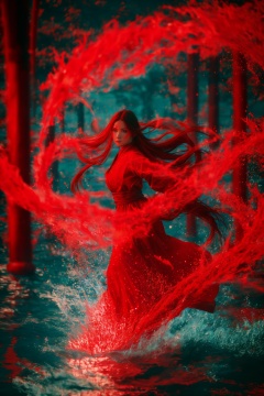 dancing,fighting stance,red-water-aura,using red-water-magic,red-water-magic,1girl,solo,long hair,blue eyes,common face,full body,<lora:magic_fighting_red_512_dreamshaper_8_2:0.8>,