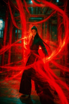 dancing,fighting stance,red-aura,using red-magic,red-magic,1girl,solo,long hair,blue eyes,common face,full body,<lora:magic_fighting_red_512_dreamshaper_8:0.8>,