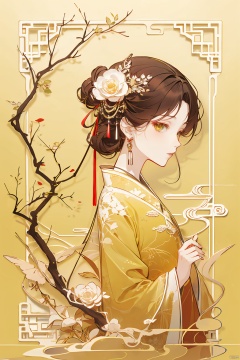1girl, solo, long hair, looking at viewer, brown hair, black hair, hair ornament, long sleeves, ribbon, jewelry, closed mouth, upper body, flower, earrings, hair flower, from side, chinese clothes, yellow background, branch, yellow theme