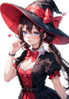 1girl, solo, hat, witch hat, blue eyes, twintails, brown hair, looking at viewer, long hair, heart, upper body, choker, bow, flower, witch, breasts, dress, bangs, bowtie, red bow, puffy sleeves, white flower, blush, closed mouth, hair between eyes, red bowtie, red choker, medium breasts, white background, smile, simple background, short sleeves, hair ornament, hand up, pink flower, black headwear, cleavage, rose
