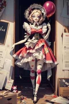 Masterpiece,High Quality,8k,full body,The clown doll,its face is a pale smiling face,painted with thick clown makeup,red lips and big eyes are particularly eye-catching. But if you look closely,this smiling face seems to hide endless sadness,and the eyes reveal a brown of despair and helplessness,and the color has peeled off,revealing the cotton inside. It held a balloon in its hand,which was supposed to be a colorful balloon,but now it has become shriveled and dull,its body is gradually broken,and its face is becoming more and more ferocious.,Unreal