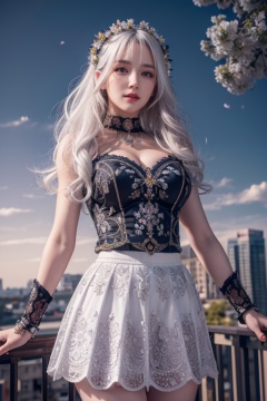 masterpiece, best quality, 1girl, (colorful),(finely detailed beautiful eyes and detailed face),cinematic lighting,bust shot,extremely detailed CG unity 8k wallpaper,white hair,solo,smile,intricate skirt,((flying petal)),(Flowery meadow) sky, cloudy_sky, building, moonlight, moon, night, (dark theme:1.3), light, fantasy