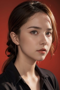 close up portrait of a woman of (german:1.5) descent,looking at camera,slight stubble,clean skin,brown eyes,wearing dark shirt,soft lighting,red background,shallow depth of field,high-resolution image,studio shot,headshot,photographic realism,, masterpiece,best quality,