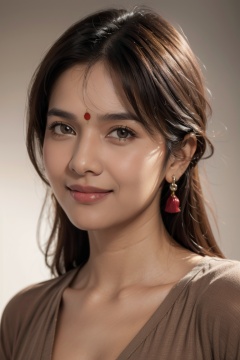 close up portrait of a woman of (indian:1.5) descent,happy and smile expression,looking at camera,slight stubble,clean skin,brown eyes,wearing dark shirt,soft lighting,gray background,shallow depth of field,high-resolution image,studio shot,headshot,photographic realism.,, masterpiece,best quality,