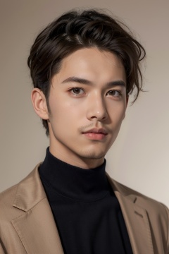 1boy,a close-up portrait of a young man with a confident expression. He has curly hair that's neatly combed,a beard,and a piercing gaze. He wears a beige turtleneck sweater over a light brown jacket. The background is a muted brown shade,putting emphasis on the subject,, masterpiece,best quality,very aesthetic,absurdres,