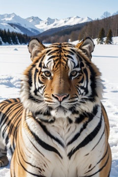 Animal Photography, a majestic tiger, draped in a coat of snow-kissed fur, gazes intently forward. snowflakes gently fall around it, capturing the serene beauty of a winter's day. the tiger's eyes, a deep amber, exude a sense of calm and confidence, while the frosty whiskers and the snow-covered muzzle add to its wintry charm., masterpiece,best quality,very aesthetic,absurdres,