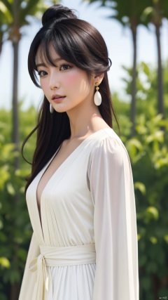 FengZeYao,1girl, black hair, long hair, dress, solo, white dress, hair ornament, chinese clothes, facial mark, hair bun, forehead mark, earrings, perfect body, scenery, sharp focus, best quality, masterpiece, detailed outfit, illustration, perfect eyes, finely detailed beautiful anime eyes, realistic skin, intricate details, best lighting, depth of field, ultra high resolution,cowboy_shot, dynamic pose, dynamic angle,