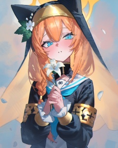 betabeet, 1girl, solo, flower, animal ear headwear, blue eyes, nun, mari (blue archive), long hair, holding, holding flower, orange hair, habit, white flower, looking at viewer, bangs, braid, long sleeves, upper body, parted lips, blush, hair between eyes, own hands together, halo, sailor collar, white sailor collar, hat, single braid, petals, frilled sleeves, puffy sleeves, blue neckerchief, neckerchief, hands up, frills, hat flower, puffy long sleeves