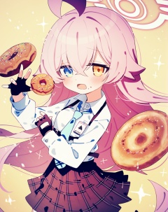 kasuga haruhi, 1girl, hoshino (blue archive), heterochromia, solo, food, gloves, pink hair, skirt, ahoge, fingerless gloves, long hair, necktie, shirt, halo, long sleeves, blue necktie, black gloves, white shirt, blue eyes, collared shirt, plaid, fang, open mouth, very long hair, plaid skirt, sparkle, yellow eyes, bread, puffy long sleeves, pleated skirt, bangs, food on face, looking at viewer, blush, hair between eyes, holding, brown skirt, puffy sleeves, holding food, orange eyes, skin fang, black skirt, doughnut, eating