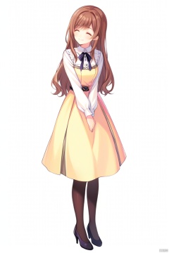 1girl, solo, long hair, smile, skirt, simple background, brown hair, white background, dress, full body, pantyhose, shoes, high heels, v arms