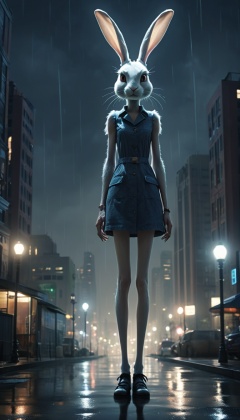 lighting,raining,thunder,(A giant monster rabbit,have extremely slim bodyshape,with extremely long and thin legs),as slim as sticks,huge rabbit,oversized,abnormally long legs,standing among low city buildings,city line,sky line,night,clouds,night,horrible shadow,fuzzylines,sketch,fluffy,a cute girl,Porta 160 color,shot on ARRI ALEXA 65,bokeh,sharp focus on subject,highest details,photorealistic,high background details,fog,high face details,8k,raytracing,