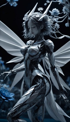 (stylish_pose:1.1),future technologies,bailing_robot,A metal robot with delicate mechanical patterns,Partial texture of a metal robot,monochrome,solo,weapon,Matte Metal,(wings:0.6),wire,hpflower,(ink art, ink illustration, ink, rough:1.3),(flowing lines),dreaming,dreams,sleeping,eyes closed,floating,(hair flowing into ink:0.8),swirling ink,((abstract)),(1girl:0.5),city,(cityscape:1.4),street,(white:1.1),rags,bailing_matte,flower,advanced gray series,science fiction,bailing_infiltrator,Masterpiece,high quality,extreme detailed,(fractal art:1.3),colorful,highest detailed,(chiffon, body painting:1.2),8k,digital art,macro photo,quantum dots,sharp focus,dark shot,cinematic,Microworld,thigh,(upper thighs shot:1.2),front view,eye-contact,high quality,extremely detailed and beautiful origami fantasy translucent magical chillet,blue and white colors,beautiful vibrant dark moonlight lake at night,sharp focus,intricate,detailed illustration,beautiful color palette,incredible details,high dynamic light,perfect composition and chiaroscuro,glowing magical moonlight,bioluminescent creature,intricately detailed,true masterpiece,full_body,