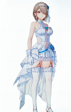 8k,best quality,masterpiece,(ultra-detailed:1.1),(high detailed skin),(full body:1.4),white background,standing,looking at viewer,(solo),hand on hip,<lora:lthuajia-v100-000029:0.8>,huajia, 1girl, rita rossweisse, wedding dress, earrings, hair over one eye, jewelry, brown hair, bride, white dress, white gloves, short hair,  white thighhighs, hair ornament, mole under eye,(white background, simple background:1.6),(beautiful_face),((intricate_detail)),clear face,((finely_detailed)),fine_fabric_emphasis,((glossy)),full_shot,