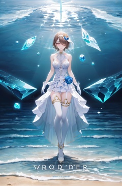simple_white_background, golden and white theme, Sense of coordination, sense of order, mathematics beauty, (((cover design))), (((((cover art))))), ((trim)), album_art, official art, (Master's work), full body, closeup, 1girl,<lora:lthuajia-v100-000029:0.8:lbw=OUTALL>,huajia, 1girl, rita rossweisse, wedding dress, earrings, hair over one eye, jewelry, brown hair, bride, white dress, white gloves, short hair, white thighhighs, hair ornament, mole under eye,beach, sand, water, sea, white geometry, colorful geometry, reflection, crystal_art, pattern_design, creative, Mystery pattern, colorful crystal decorate, blue crystal, (architectural art), ((geometric art)), pattern design, creative, shine, dream,swimming in ocean,------,Low saturation, grand masterpiece, Perfect composition, film light, light art,
