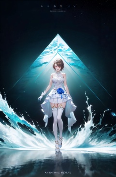 simple_white_background, golden and white theme, Sense of coordination, sense of order, mathematics beauty, (((cover design))), (((((cover art))))), ((trim)), album_art, official art, (Master's work), full body, closeup, 1girl,<lora:lthuajia-v100-000029:0.8:lbw=OUTALL>,huajia, 1girl, rita rossweisse, wedding dress, earrings, hair over one eye, jewelry, brown hair, bride, white dress, white gloves, short hair, white thighhighs, hair ornament, mole under eye,beach, sand, water, sea, white geometry, colorful geometry, reflection, crystal_art, pattern_design, creative, Mystery pattern, colorful crystal decorate, blue crystal, (architectural art), ((geometric art)), pattern design, creative, shine, dream,swimming in ocean,------,Low saturation, grand masterpiece, Perfect composition, film light, light art,