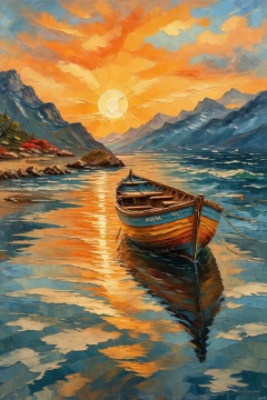 Impressionism fine art impasto on canvas by Van Gogh. Blissful sunset hues.outdoors, sky, cloud, water, no humans, ocean, cloudy sky, scenery, reflection, sunset, mountain, sun, watercraft, waves, boat, orange sky,airbrush painting. Atmospheric, moody, rustic.,Oil Painting