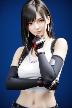 (masterpiece), (best quality),realistic,octane render,3D CG,1girl,tifa lockhart,solo,long hair,earrings,black hair,jewelry,suspenders,crop top,breasts,looking at viewer,upper body,brown eyes,bangs,shirt,gloves,elbow gloves,midriff,elbow pads,medium breasts,lips,**** top,blue background,white **** top,artist name,bare shoulders,closed mouth,white shirt,sports bra,sleeveless,
