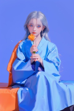 1girl,o_style,o_style,solo,1girl,blue background,flower,jewelry,looking at viewer,earrings,holding,simple background,sitting,holding flower,long sleeves,blue eyes,wide sleeves,artist name,petals,grey hair,<lora:o_style_512_dreamshaper_8:0.8>,