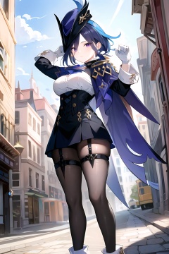 (masterpiece, best quality:1.2),insanely detailed,absurdres,ultra-highres,ultra-detailed,best quality,slender,kawaii,perfect symmetrical face,ultra cute girl,ultra cute face,ultra detailed eyes,ultra cute,ultra beautifu,clorinde \(genshin impact\),1girl,solo,purple eyes,hat feather,tricorne,white gloves,low ponytail,blue cape,blue hair,epaulettes,black pantyhose,ascot,breasts,black skirt,corset,blue headwear,boots,leg garter,black corset,shirt,earrings,<lora:clorinde-000001:1>,outdoors,standing,arms up,