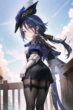 (masterpiece, best quality:1.2),insanely detailed,absurdres,ultra-highres,ultra-detailed,best quality,slender,kawaii,perfect symmetrical face,ultra cute girl,ultra cute face,ultra detailed eyes,ultra cute,ultra beautifu,clorinde \(genshin impact\),1girl,solo,purple eyes,hat feather,tricorne,white gloves,low ponytail,blue cape,blue hair,epaulettes,black pantyhose,ascot,breasts,black skirt,corset,blue headwear,boots,leg garter,black corset,shirt,earrings,<lora:clorinde-000001:1>,sky,outdoors,standing,from behind,looking down,